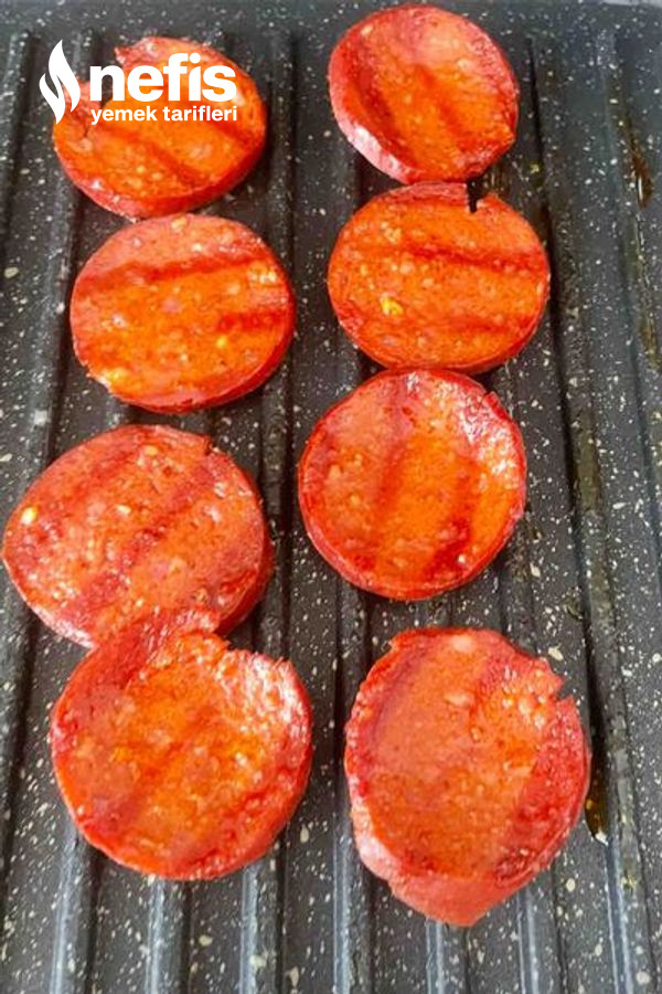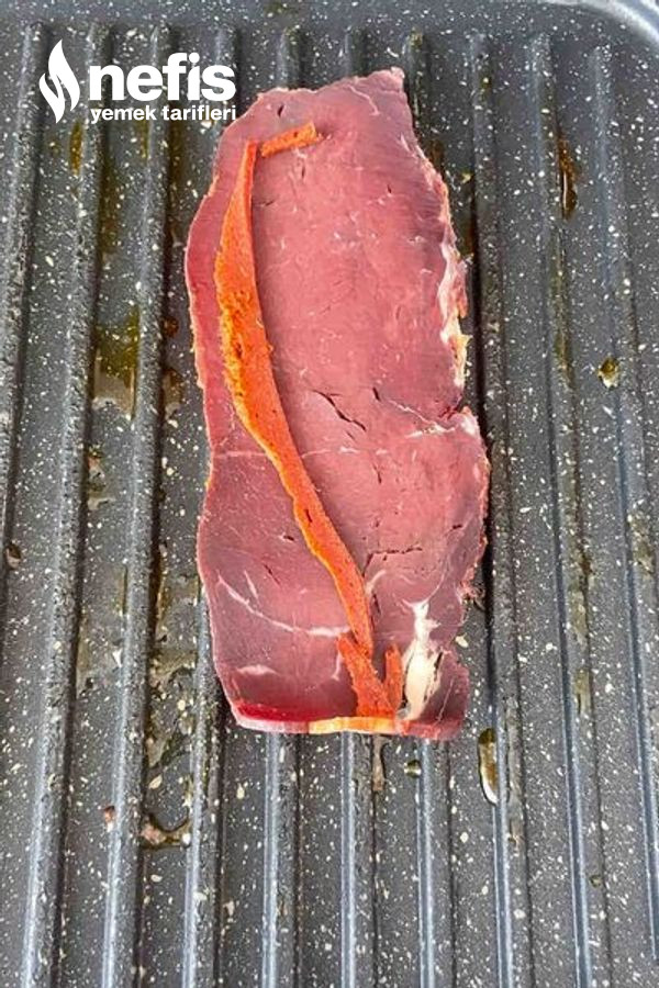 - Hellimden sonra pastırmayı çok az ısıtıp ekmeğin içine alalım.