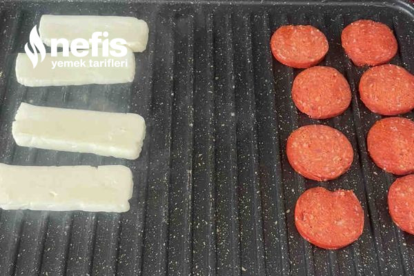 - Arkasından dilimlenmiş hellim peynirini tost makinesinde kızartıp; sucukların üzerine koyalım.