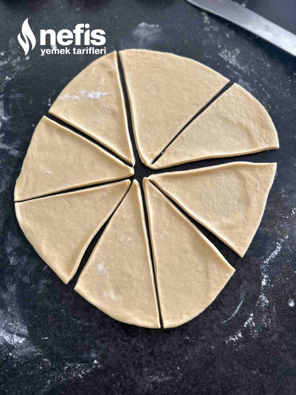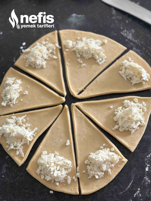 7. Her topu pizza üzere aç. 8–12 üçgen modül kes. Her kesime biraz peynirli içten koy.