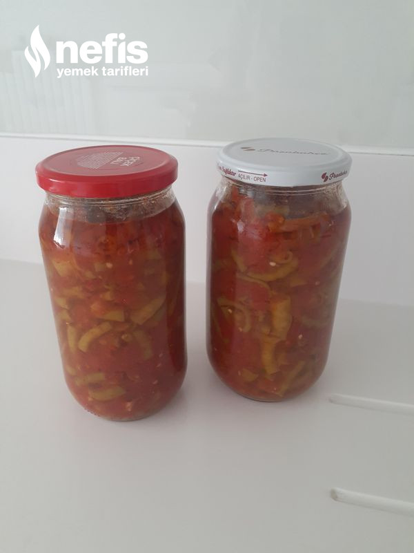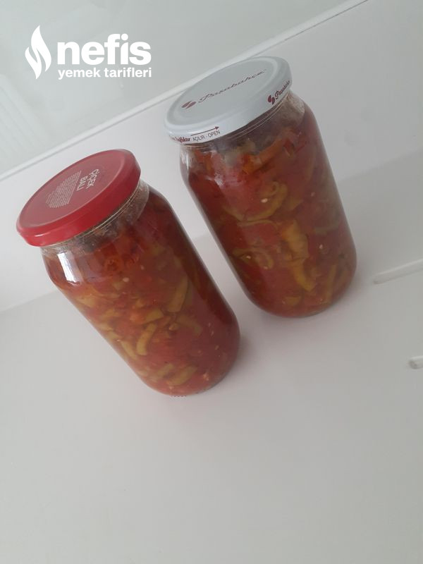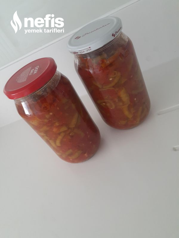 1. İlk evvel tenceremizi alıyoruz ve ısıtıyoruz ,daha sonra zeytinyağımızı ve sirkemizi tenceremize döküyoruz ,kaynatıyoruz o hafif kaynayana kadar da biberlerimizi robottan geçiriyoruz fakat çok sulu olmayacak biraz dişe gelebilir ve onu da kaynayan sirke karışımımızın üzerine döküyoruz.Onu da kaynamaya bırakıyoruz.