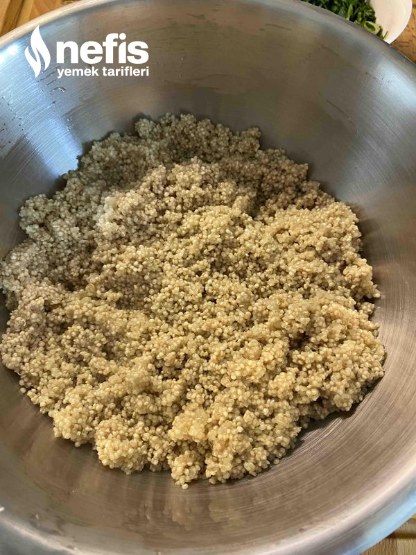 - Haşlanmış kinoaları kaşıkla biraz havalandırıp içine evvel soğanlı salçalı karışımı,daha sonra taze soğanlı yeşillikli karışımı da dökerek harmanlayalım.