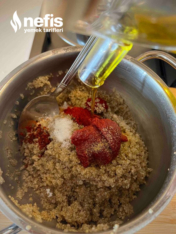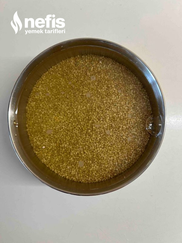 1. Öncelikle kinoaları uygun bir kaba alıp üzerine kaynamış su ekleyip 15 dakika bekletiyoruz. Akabinde bir kaşıkla uygunca karıştırıp suyun içinde yıkanmasını sağlayıp suyunu süzüyoruz.