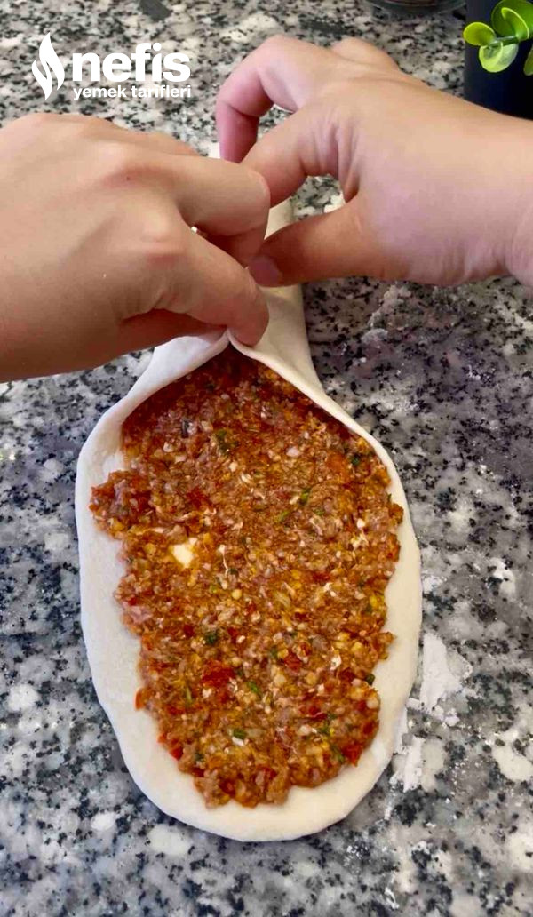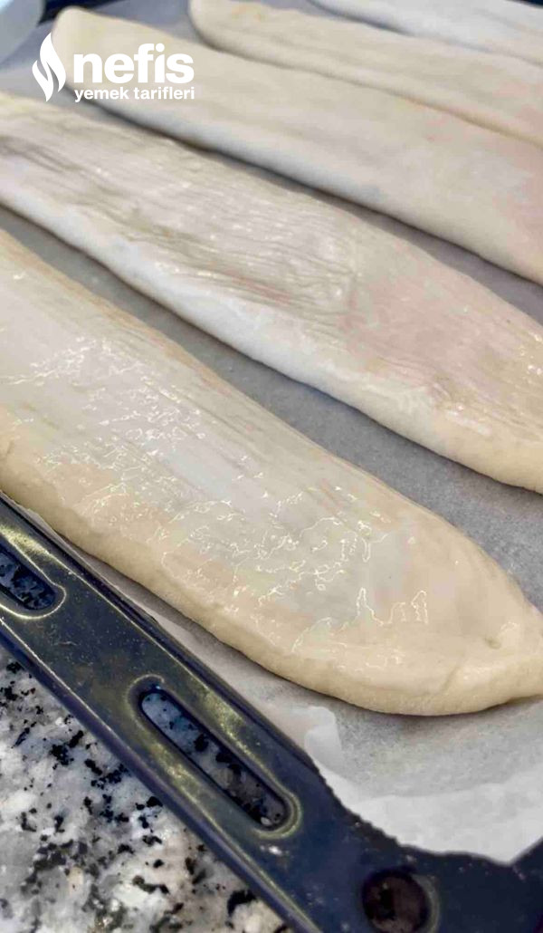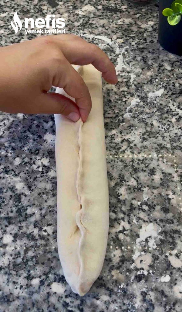 3. Mayalanan hamuru 12 beze yapalım. Uzun formda açıp içinde kıymalı harcı koyup elimizde kapatalım. (görsellerde ekledim) kapattığımız yer tepsinin altına gelecek formda yerleştirelim. Üzerine su ve unu karıştırıp sürelim.
