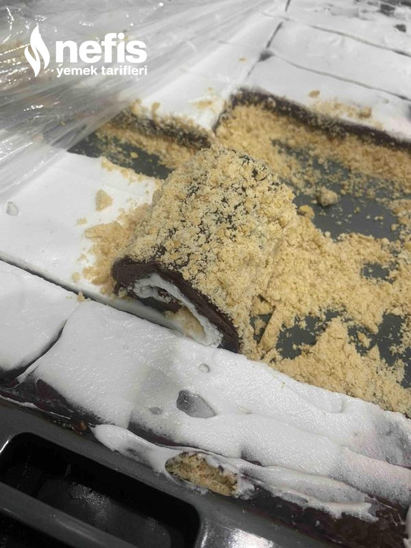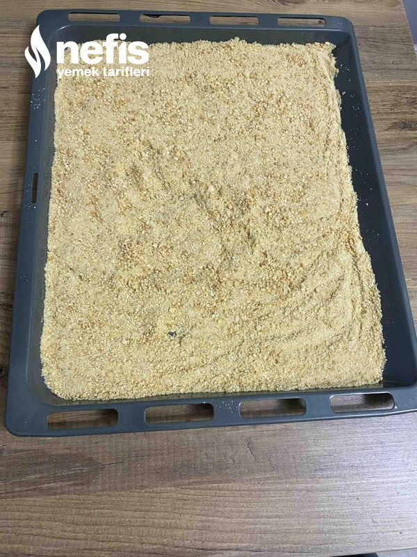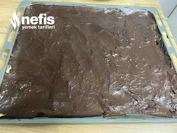 - Bisküvileri ezin ve tepsiye yayın pişen karışımı çabucak dökün ( tepsiye yayarak dökün yoksa dağıtmak zorlaşır).