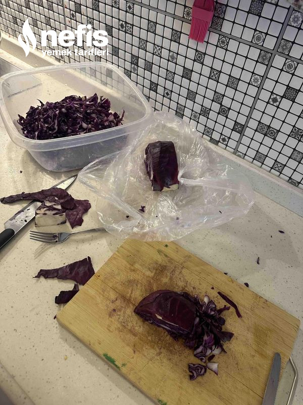 - 1 adet orta uzunluk lahanayı ince doğrayalım.