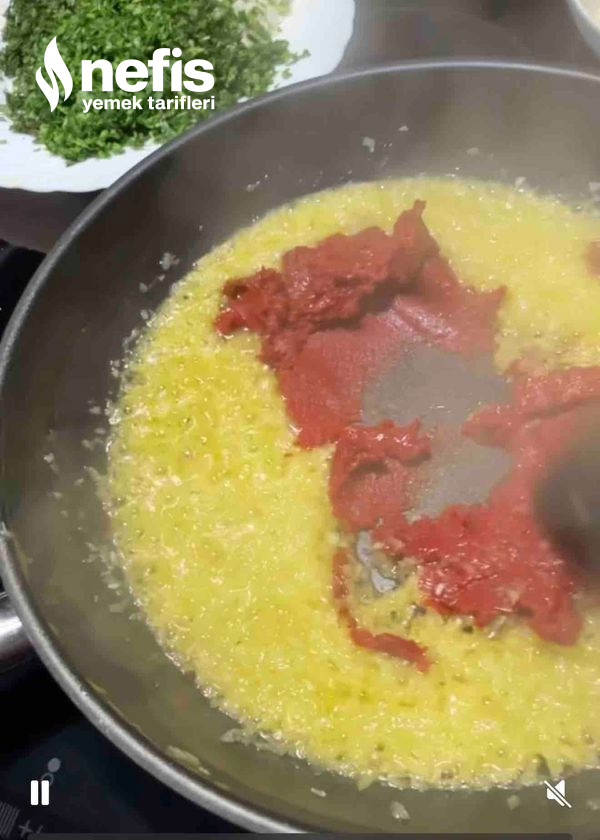 - Tavaya yemeklik doğranmış soğanı, sarımsağı ve zeytinyağını ekleyip soğanlar hafif sararmaya başlayınca içine salçaları ve baharatları ekleyip, karıştırıp kenara alalım.