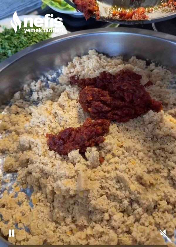 - Dinlen mercimeği yoğurma kabına alıp üzerine kavurmuş olduğumuz sosu ek edip düzgünce yoğurun.