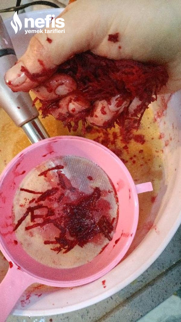 Not;en son çiğden ek ettiğimiz pancar rengi tamamlıyor isterseniz koymayabilirsiniz yada bir adet pancar suyu ek edebilirsiniz şayet koymazsanız rengi kremit rengi oluyor lakin benim yaptığım üzere yaparsanız hem çiğden olduğu için ayrıyeten vitamin artıyor hemde rengi olağanüstü oluyor lütfen deneyin.