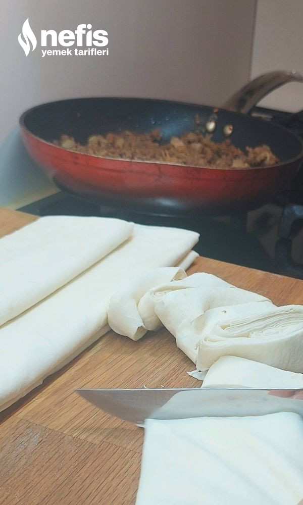 - Soğan ve kıymayı kavurarak tuz ve toz biberini de eklediğimiz iç harcını yufkaların üzerine yayıyoruz.