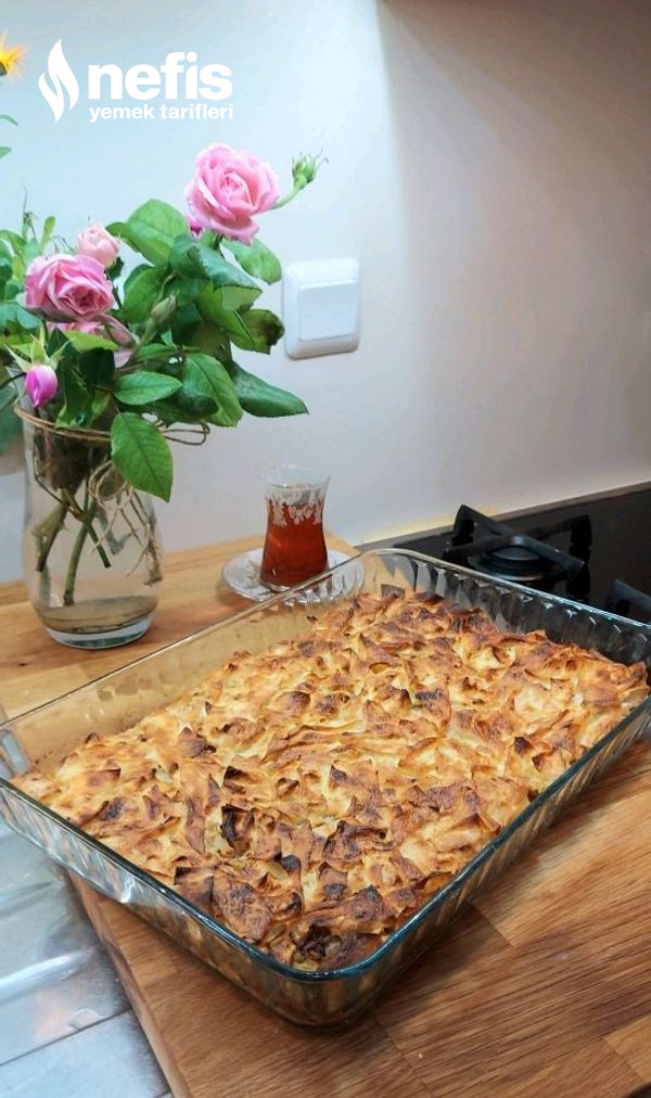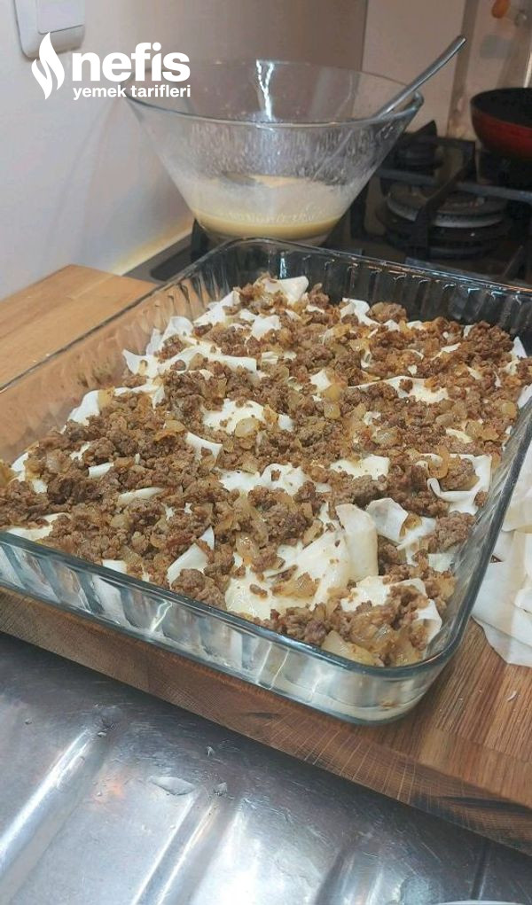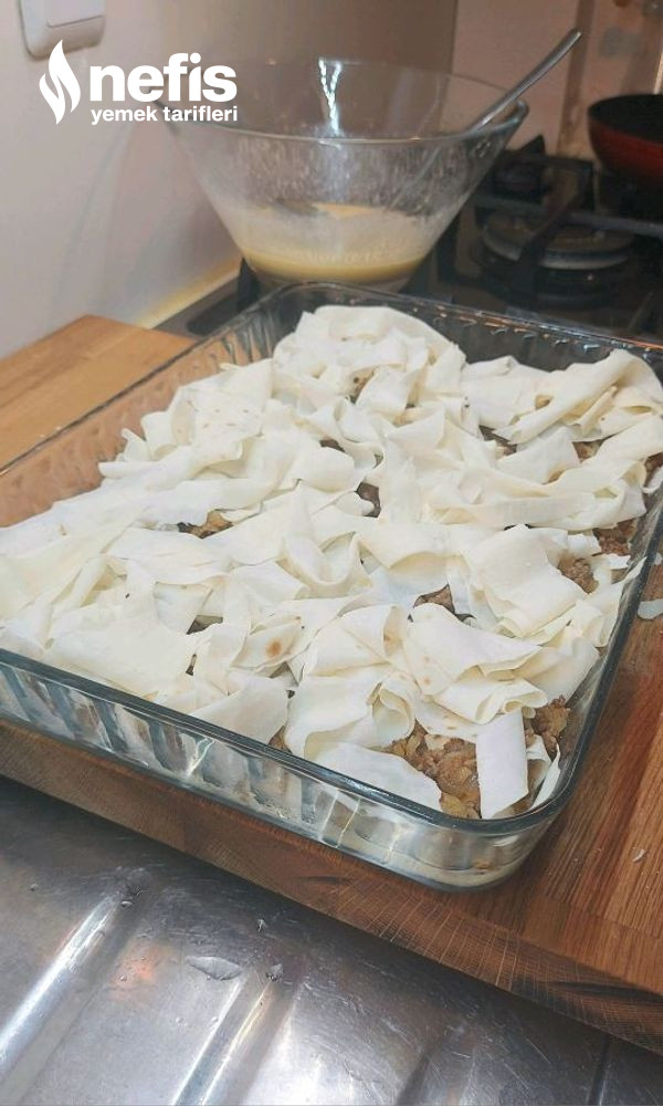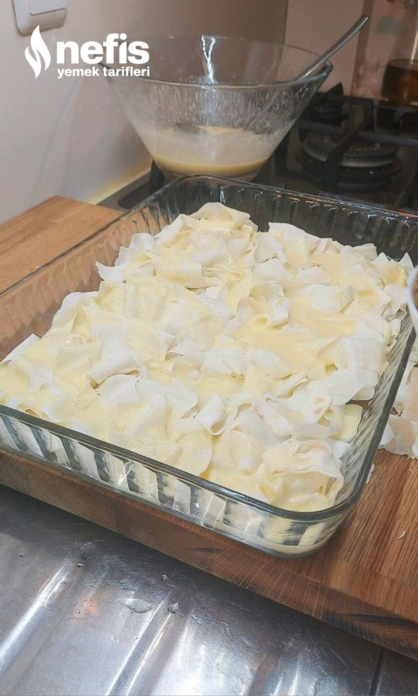 - Yufkaların başka kalan yarısınıda eşit biçimde tepsiye yaydıktan sonra kalan sosundan heryere gelecek biçimde gezdirerek döküyoruz .