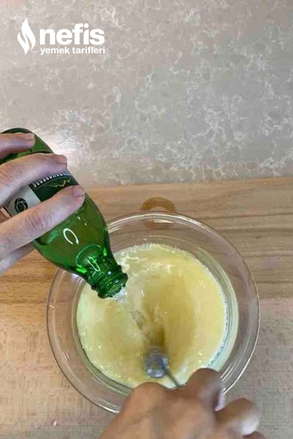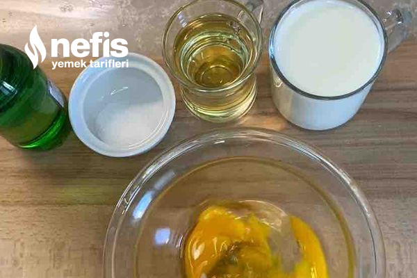 1. Öncelikle sosunu hazırlamak için derin bir kasenin içine yumurta,süt,sıvı yağ,tuz ve maden suyunu koyarak karıştıralım.