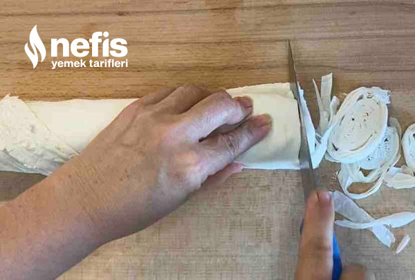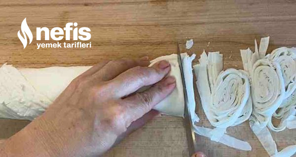 3. Bir tarafı başka tarafın üzerine koyup tekrar katlayıp üçgen haline gelince rulo formu yaparak bıçak yardımıyla şerit halinde ince ince keselim. ( görseldeki gibi).