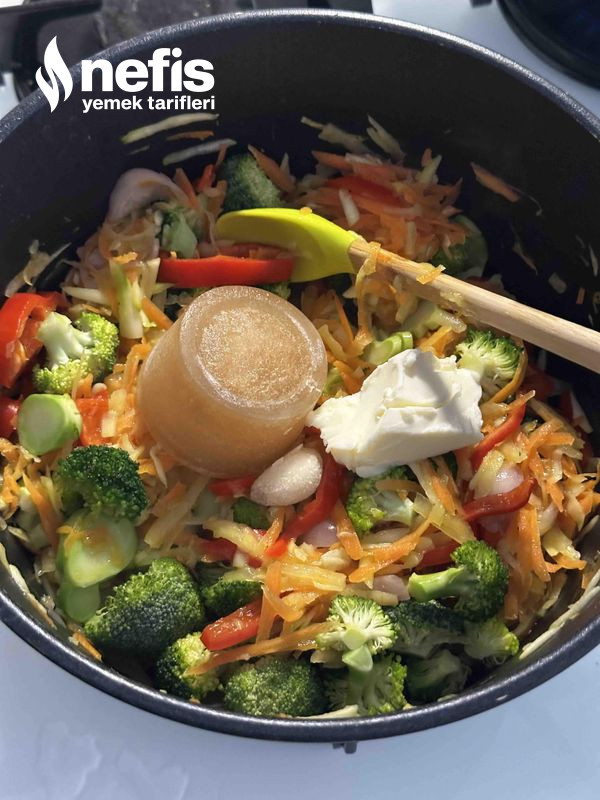 - Üzerine tereyağ ve et suyunu koyalım. Ben hem et suyu hem su kullandım.