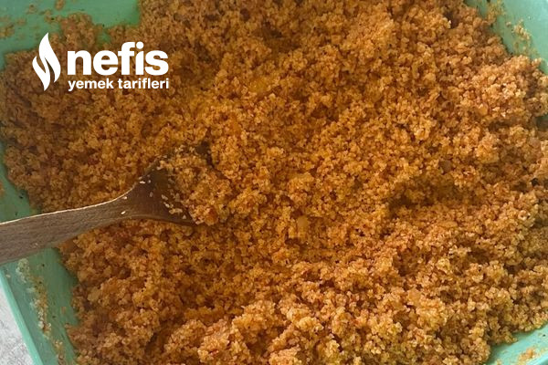 3. Pişirdikten sonra kabaran bulgurun üzerine salçamızı döküyoruz ve baharatlarımızı ekliyoruz.