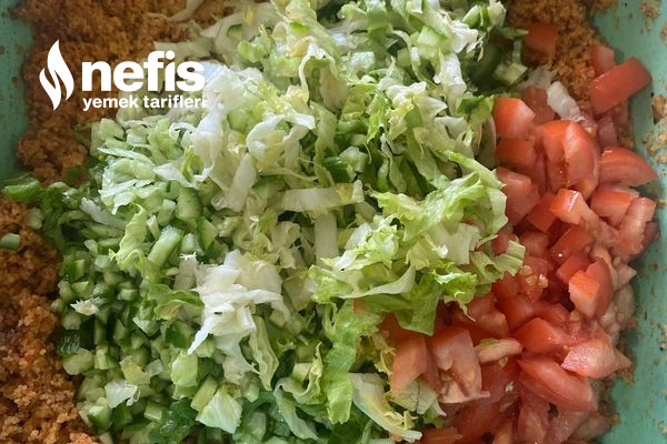 6. Bulgur soğuduktan sonra doğradığımız malzemelerimizde ekleyip karıştırıyoruz, üzerine limon ,nar ekşisi ekleyip servis ediyoruz.
