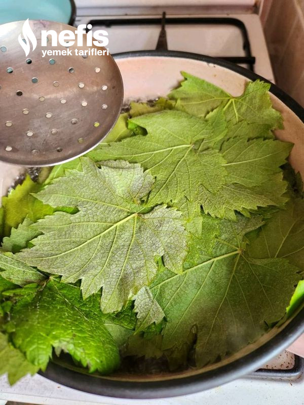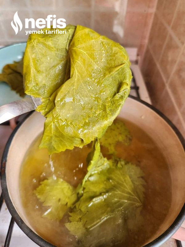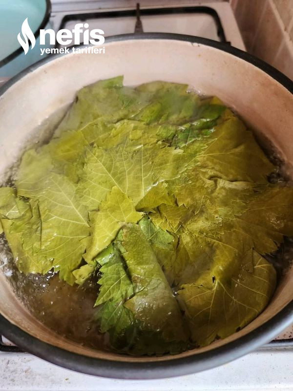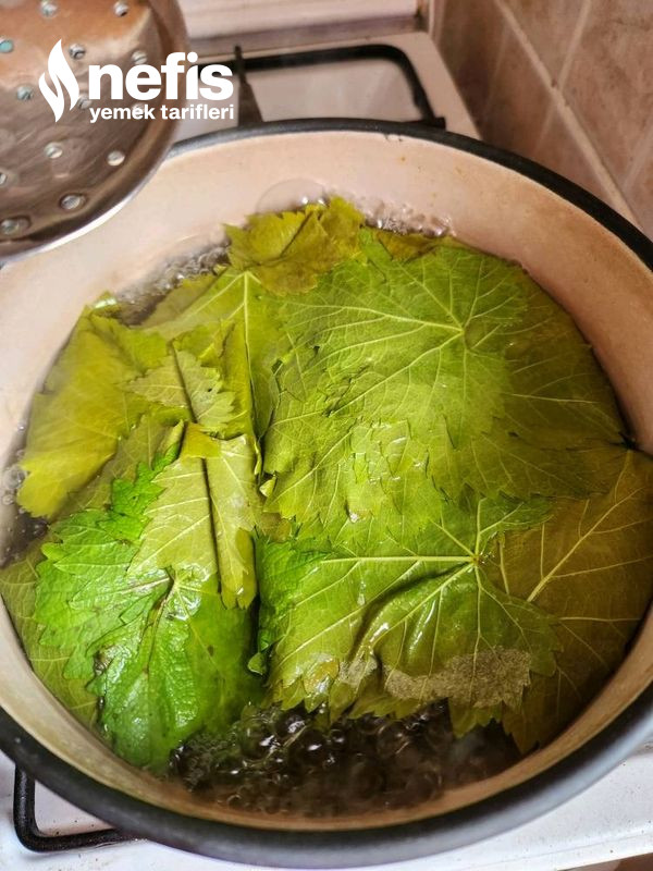 3. Su kaynamaya başlayınca asma yapraklarından 8-10 tane kadarı suya konulur.