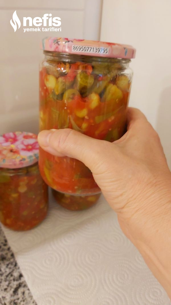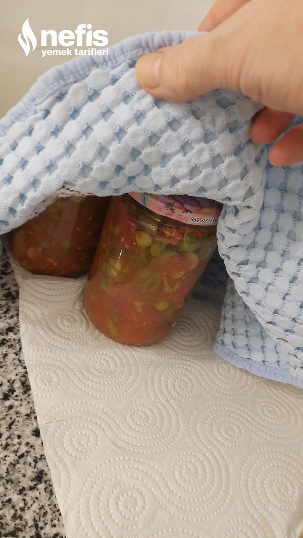 - 1 çay kaşığı şekeri 1 tatlı kaşığı tuzu ekleyelim, yavaşça karıştırıp altını yeterlice kısalım çabucak kavanozlara doldurup ağız kısımlarını havlu kağıt ile silip yeni kapakla kapağı 2 geri 1 ileri biçiminde sıkıca kapatıp üzerini bir mutfak bezi ile kapatalım .