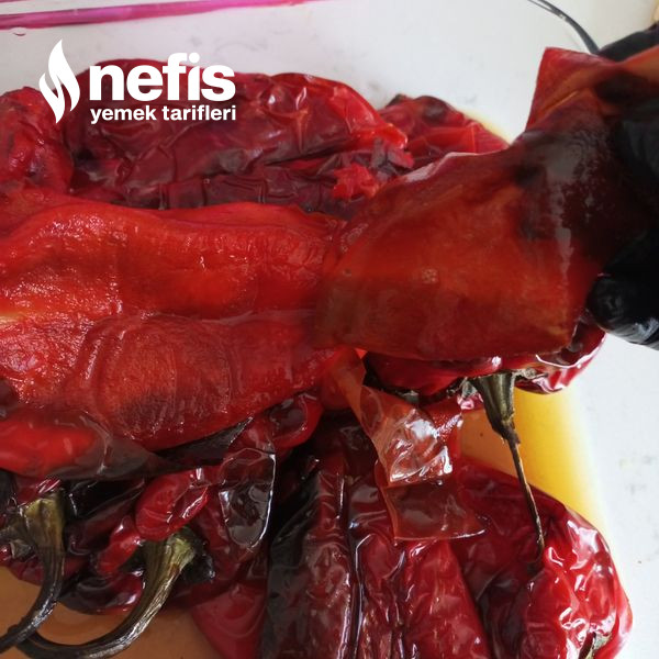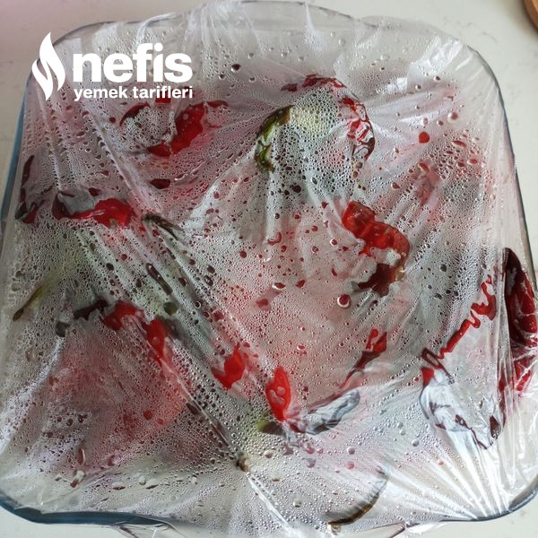 - Közlenmiş biberleri bir kabın içerisine alıp üzerini pak bir poşetle kapatıp 10 15 dakika bekletelim ki kolay soyulsun.