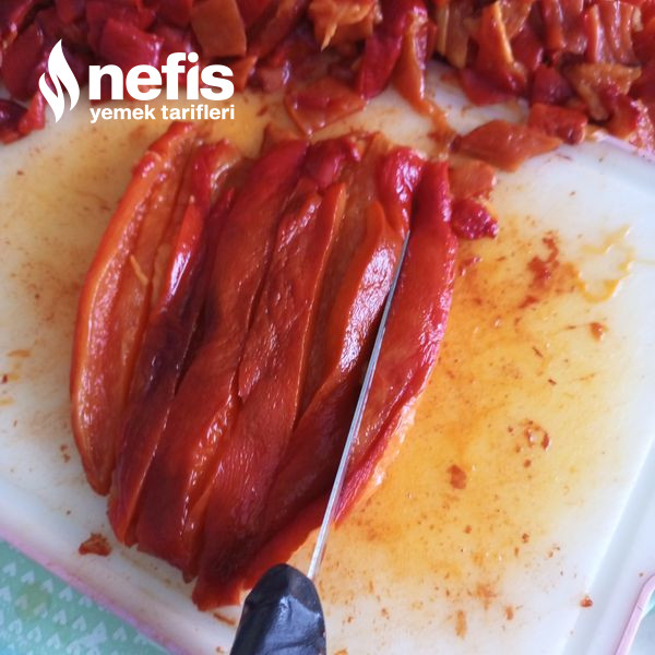 - Sürenin sonunda biberleri soyalım çekirdeklerini temizleyelim evvel şeritler halinde sonra da küp küp keselim.