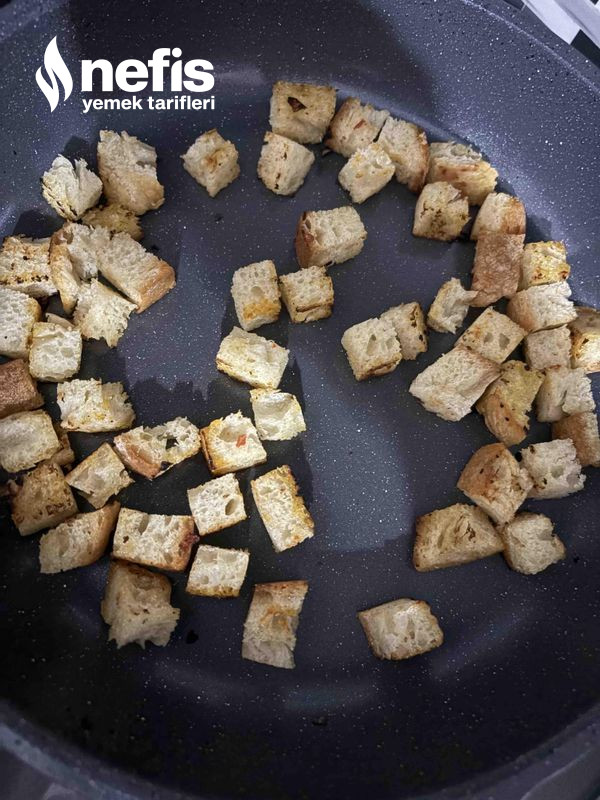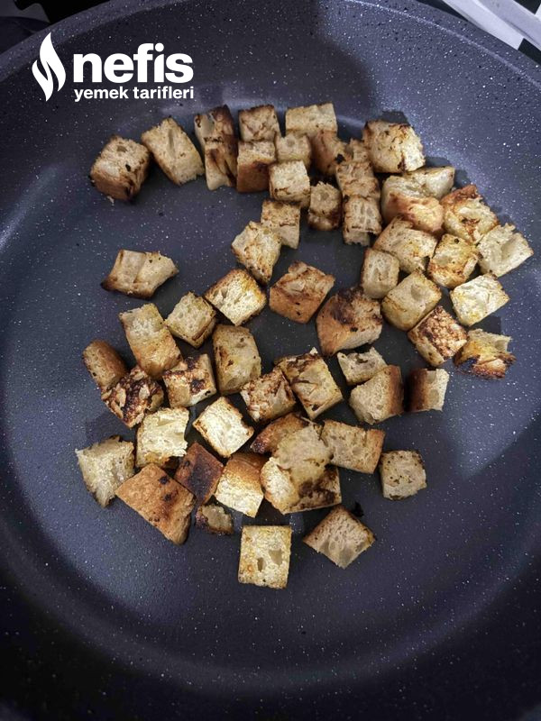 4. Ekmeklerimizi küp küp doğrayalım. Bir tavada bir yemek kaşığı zeytinyağ ile kıtır kıtır olana kadar orta ara karıştıralım. İstediğimiz kıvama geldiğinde ocağın altını kapatalım.