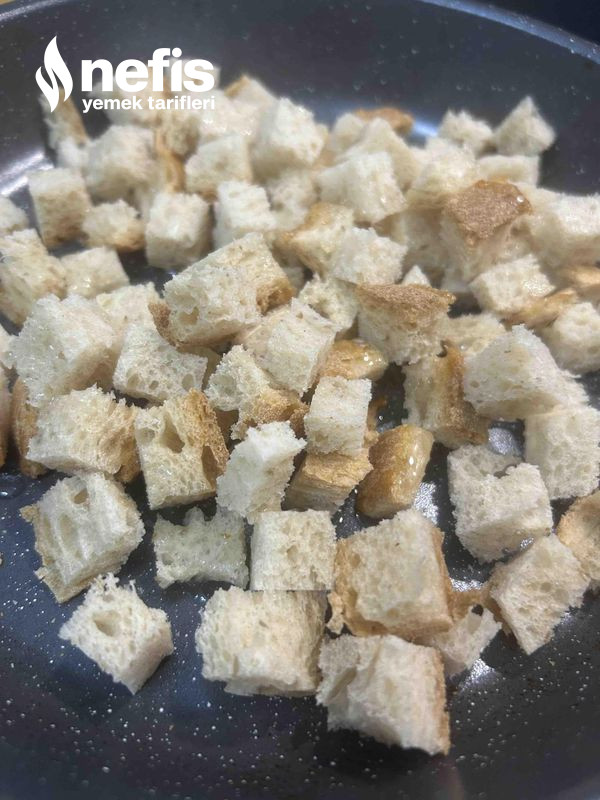 4. O sırada ekmek dilimlerini küçük küp şekilinde kesip yağ ile bir tavaya alıyoruz.