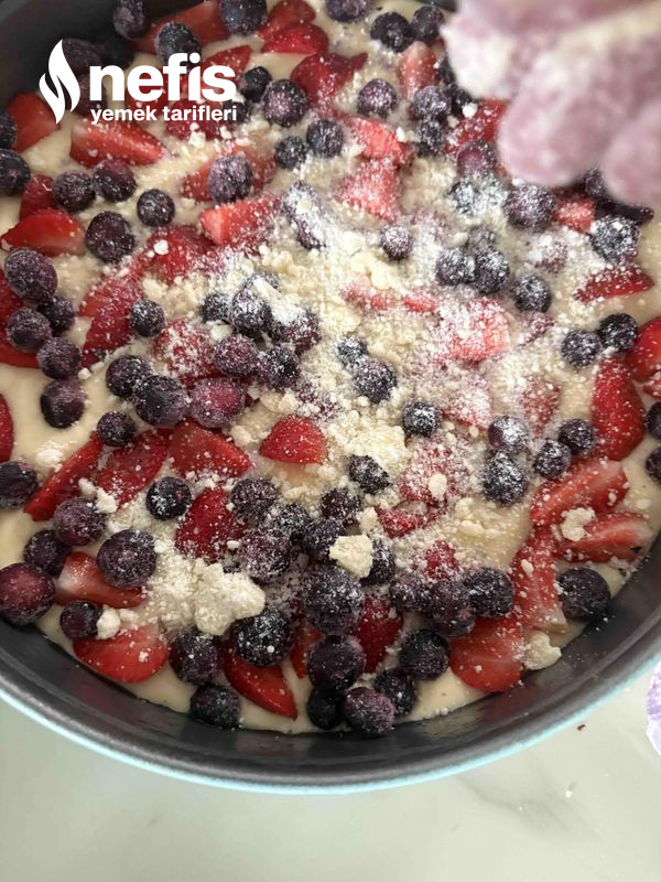 - Kek hamurunu kalıba dökünüz ,üzerine meyveleri serpiniz ,dilediğiniz meyveylede yapabilirsiniz.