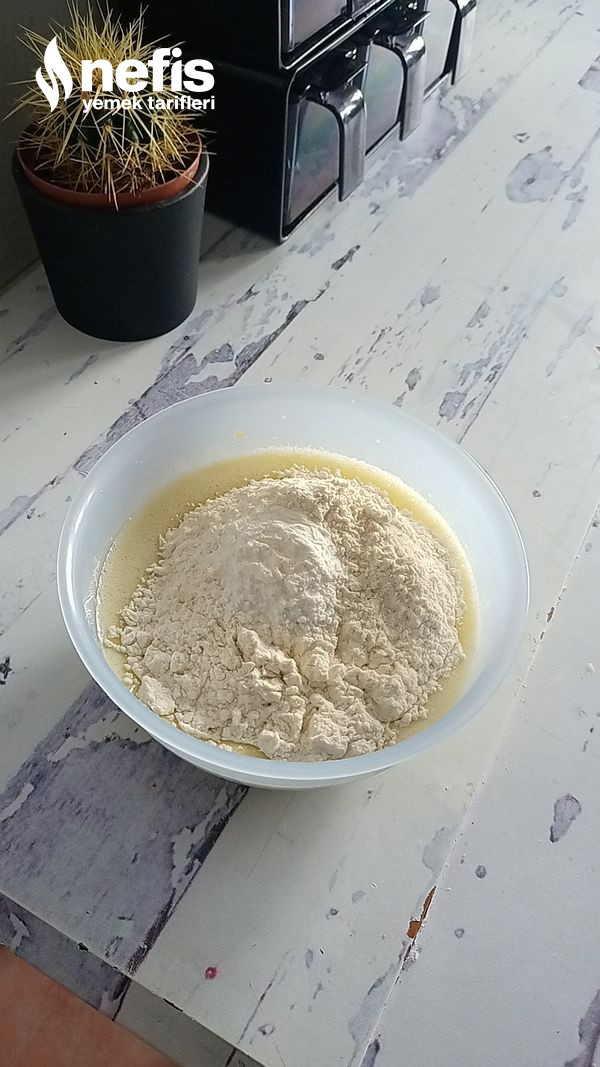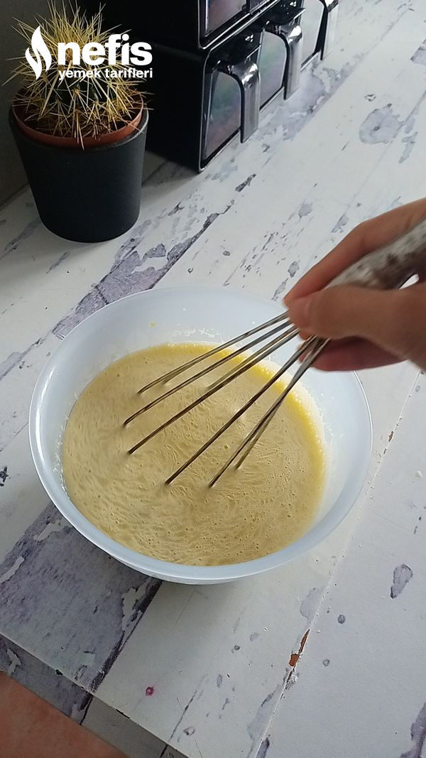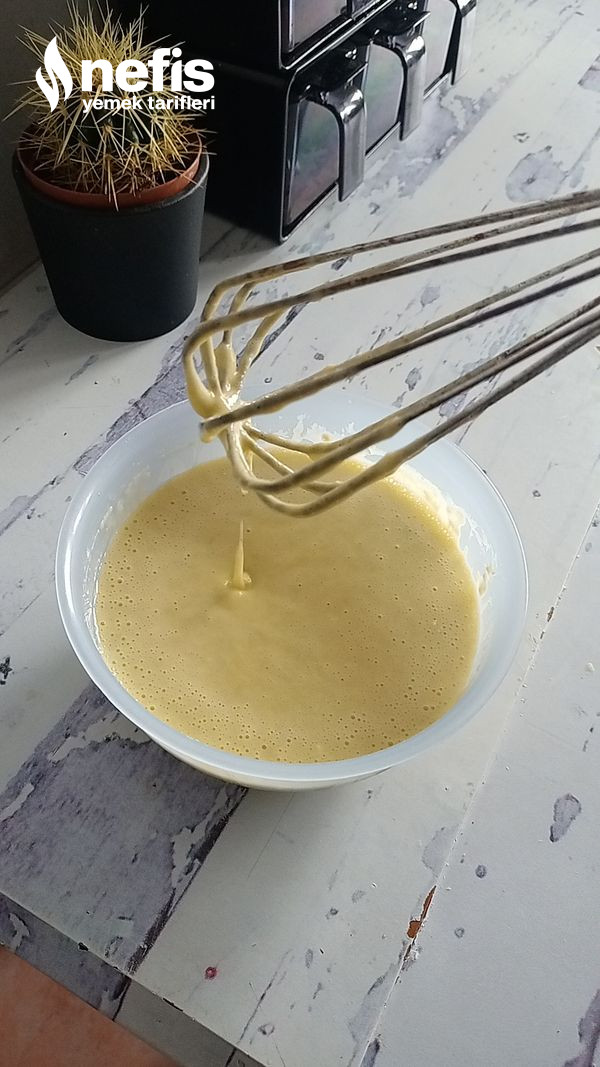 - Toz şeker, süt ve sıvı yağı ekleyip şeker büsbütün eriyene kadar çırpın.