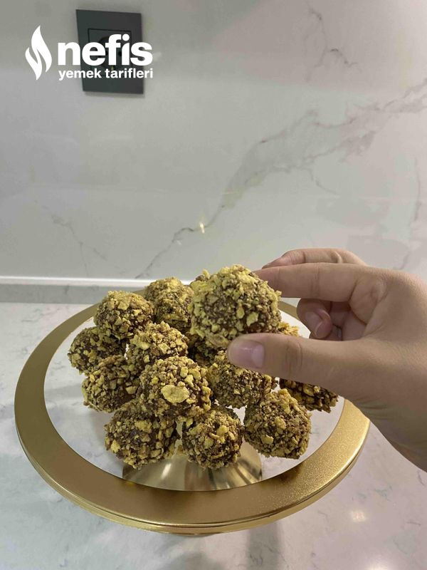 - Piştikten sonra birinci sıcaklığı çıkınca benmari yordamı erittiğimiz çikolataya sonrada ince kırdığımız mısır gevreklerinin içerisinde bir tıp çevirelim.