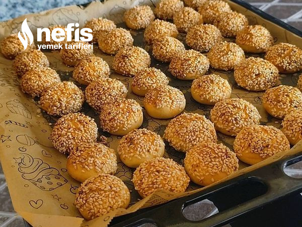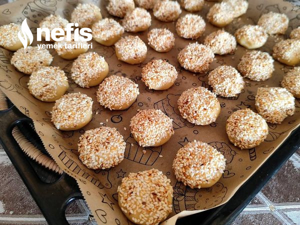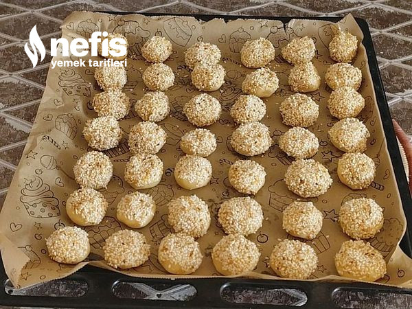 3. Hamurdan cevizden küçük kesimler koparıp yuvarlayıp evvel pekmezli suya daha sonra susama batırıp yağlı kağıt serilmiş tepsiye dizelim .
