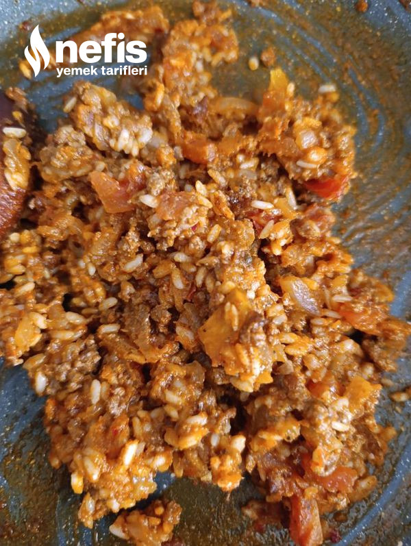2. Kavrulan kıymanın üzerine salçaları ek edelim akabinde kabuklarını soyup ince ince doğradığımız domatesleri ekleyip 5/10 dk kadar kavurmaya devam edelim ve pirincimizi ekleyelim ve üzerine 1 çay bardağı sıcak suyu ekleyelim bir iki tıp çevirdikten sonra baharatlarını ekleyip, harcımız suyunu çekene kadar pişirelim.