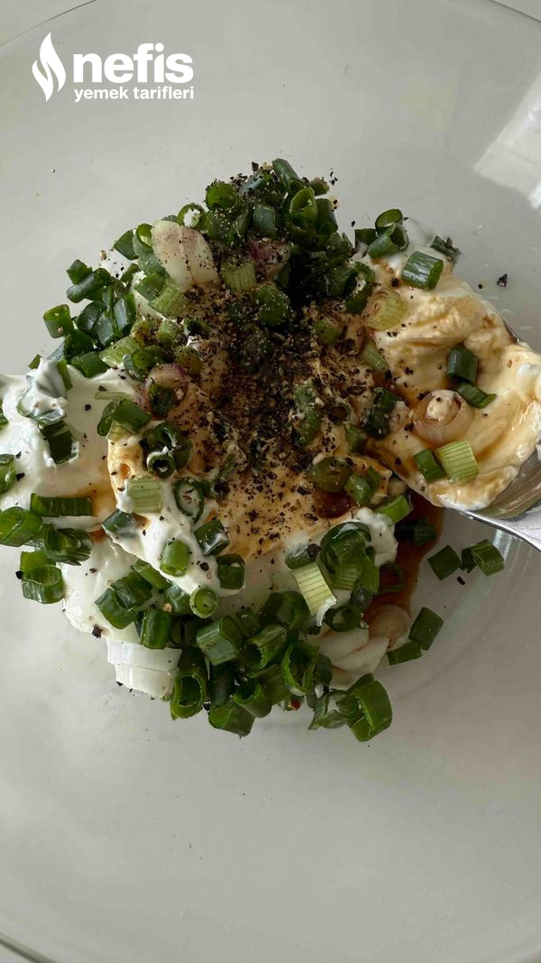 - Bir kasede yoğurt, ince kıyılmış yeşil soğan ve soya sosu karıştırın.