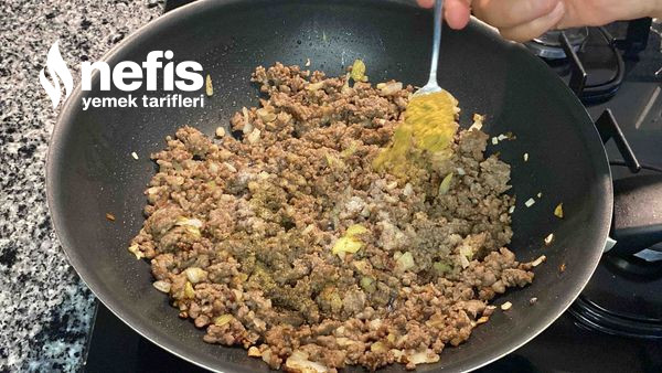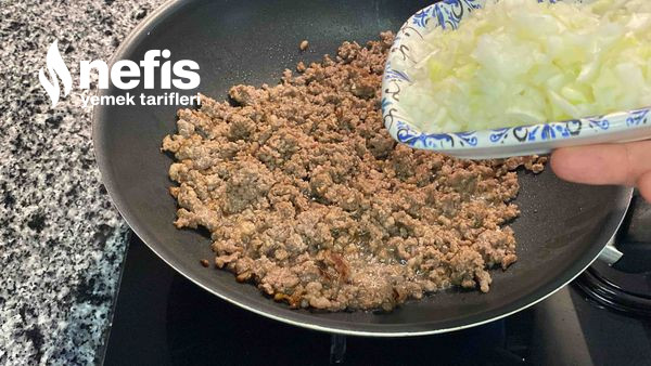 - Kıymayı tavaya koyalım kavuralım ,kıyma suyunu salıp çekince içerisine yağını katıp yemeklik doğradığımız kuru soğanı ek edelim ,karıştıralım .