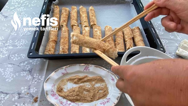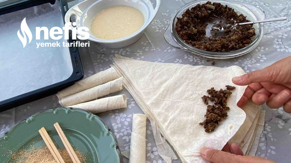 - Her bir yufkanın içerisine sigara böreği sarar üzere iç arzından bırakalım yanlardan içerisine kapatalım ,rulo formunda saralım .