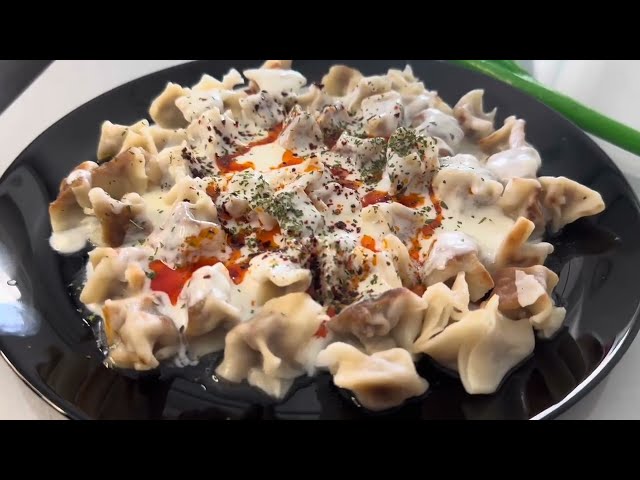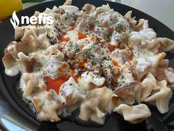 - Üstüne kızarmış kırmızı yağ ile nane döküp bu iştah açıcı mantıyı sunuma hazır hale getirelim.