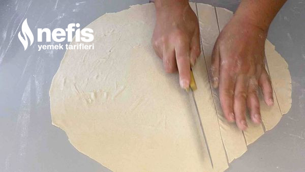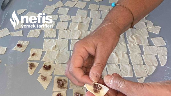 - Yufkamızı birikim milim inceliğinde açıp şeritler halinde keserek hazırlayalım içinden kıymamızı koyup görüntüde gösterdiğim üzere 4 ucunu bir ortaya getirip mantımızı kapatalım.