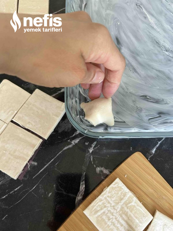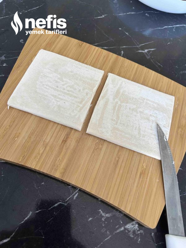 - Milföy hamurlarımızı teker teker ayırıp, dikdörtgen yaprak hamuru ortadan keselim kare biçiminde iki yaprağa ayıralım daha sonra bu kareleride dörde keserek sekiz küçük kare elde edelim, öbür kalan beş adet yaprağı da birebir formda karelere keselim.