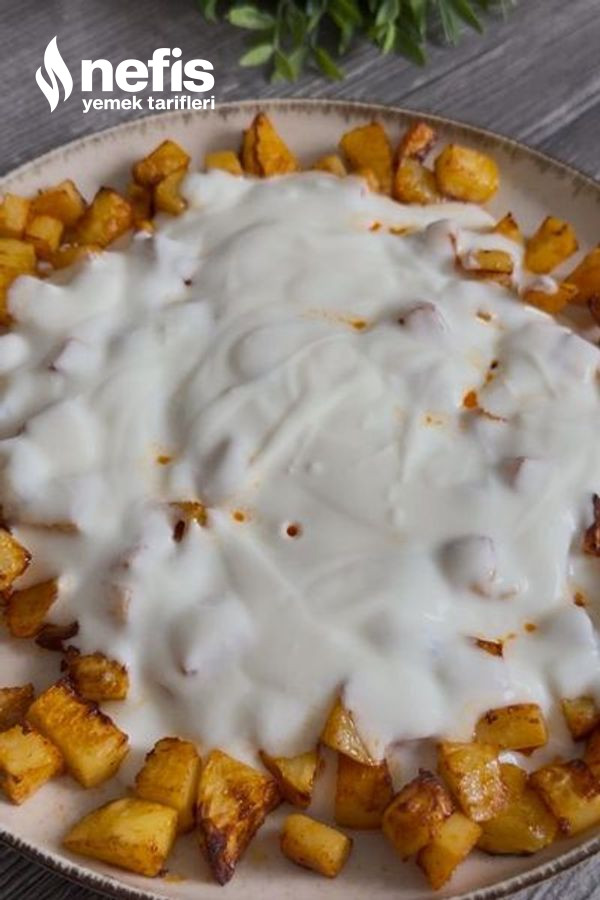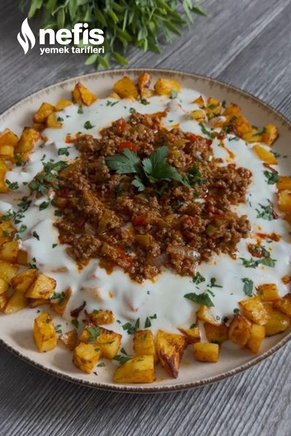 12. Servis tabağına patatesleri alalım, üzerine yoğurtlu sosu gezdirelim. Ve son olarak kıymayı üzerine yayalım. Deneyeceklere simdiden afiyet olsun ❤️🤗.