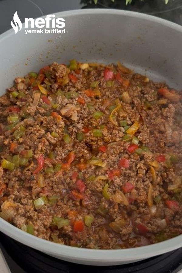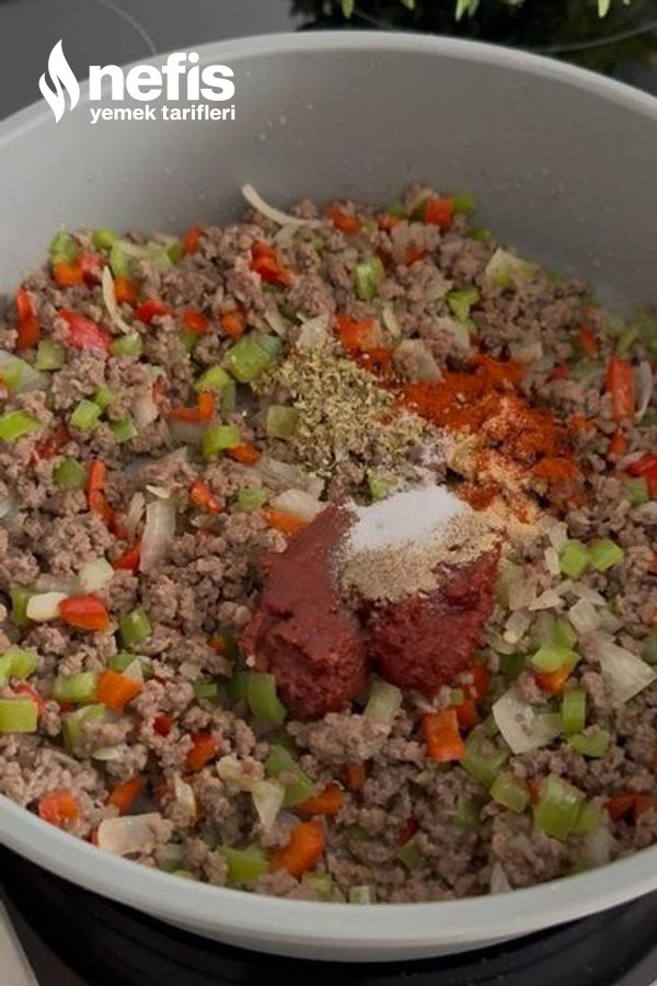 9. Su, domates sosu, baharatlar ve tuzu ekleyip orta ateşte 5 dakika pişirmeye bırakalım.