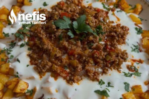 12. Servis tabağına patatesleri alalım, üzerine yoğurtlu sosu gezdirelim. Ve son olarak kıymayı üzerine yayalım. Deneyeceklere simdiden afiyet olsun ❤️🤗.