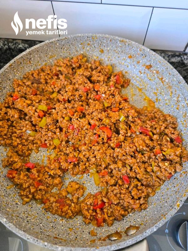 - Daha sonra biberleri ve salçamızı ekleyip kavurmaya devam edelim, tuzumuzu, karabiberimizi, kırmızı biberi ekleyip karıştıralım sonrasında 1 su bardağı sıcak suyu ekleyip kıymalar suyunu çekince altını kapatalım.