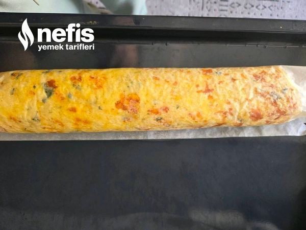 - Fırında pişen pateslerimizi çıkaralım, sıcak sıcak rulo yapalım ki soğuyunca kurumasın, iç harcını güzelce patateslerin üzerine yayalım, sonra yağlı kağıt ile takviye vererek rulo yapalım.