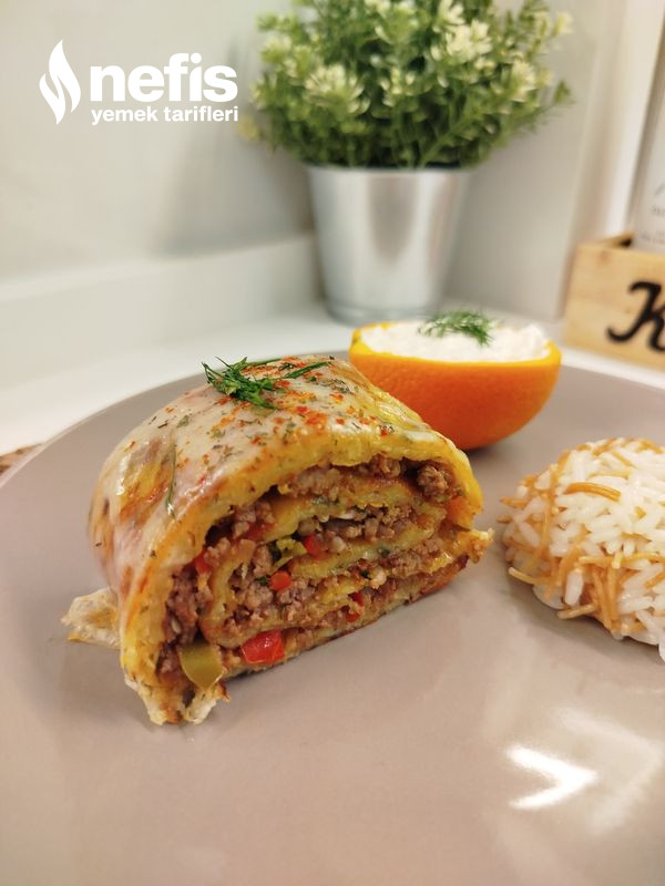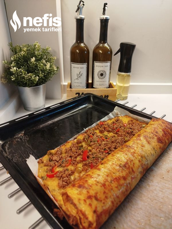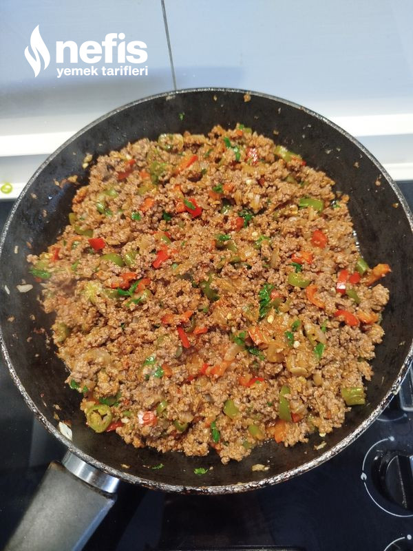 5. İçerisine kıyma harcımızı dökelim ve yayalım. Dürüm halinde saralım.