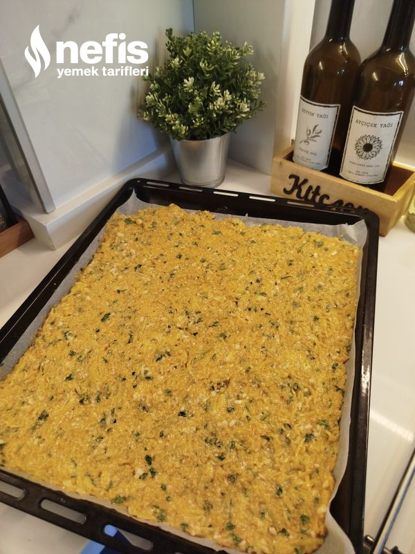 4. Yağlı kağıt serili tepsiye harcımızı basalım ve 180° fırında üzeri kızarana kadar pişirelim.