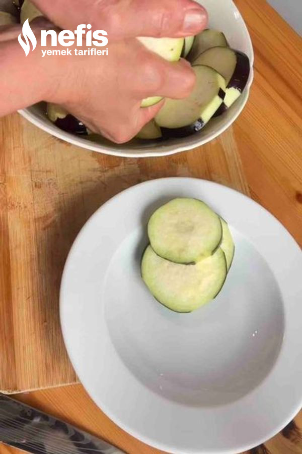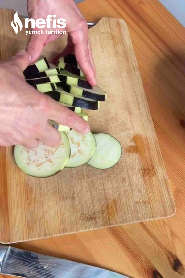 - Patlıcanları alacalı soyup yuvarlak (yaklaşık 2 cm kalınlığında) doğrayın.