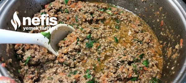 - Öncellikle kıymayı 1 su bardağı suda suyunu salıp çekene kadar haşlayın. Haşlandığı halde suyu fazla olduysa dökebilirsiniz.