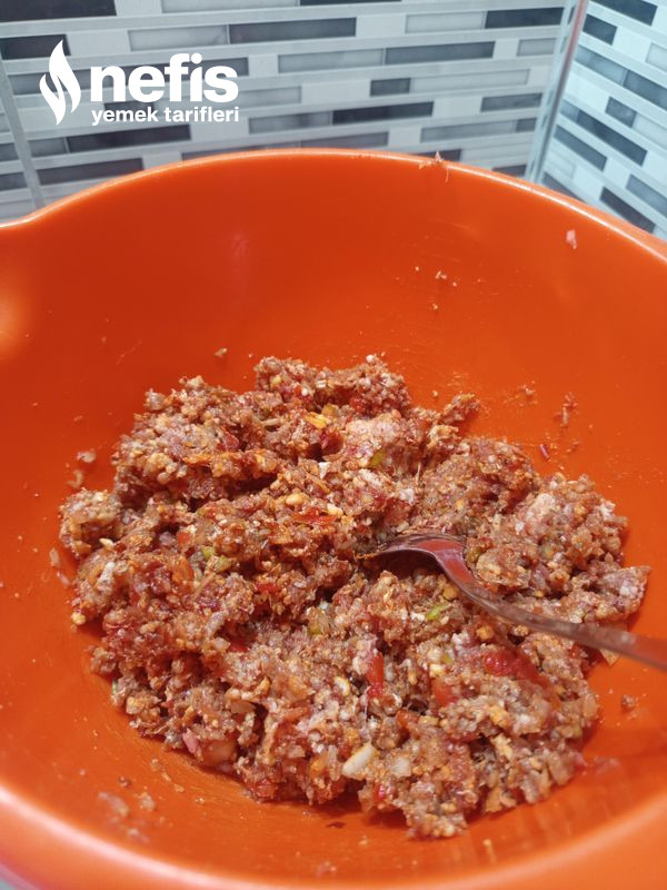 - Kıymaya yeşil biber, soğan, kırmızı biber, salçalar ve baharatları ekliyoruz karıştırıyoruz.