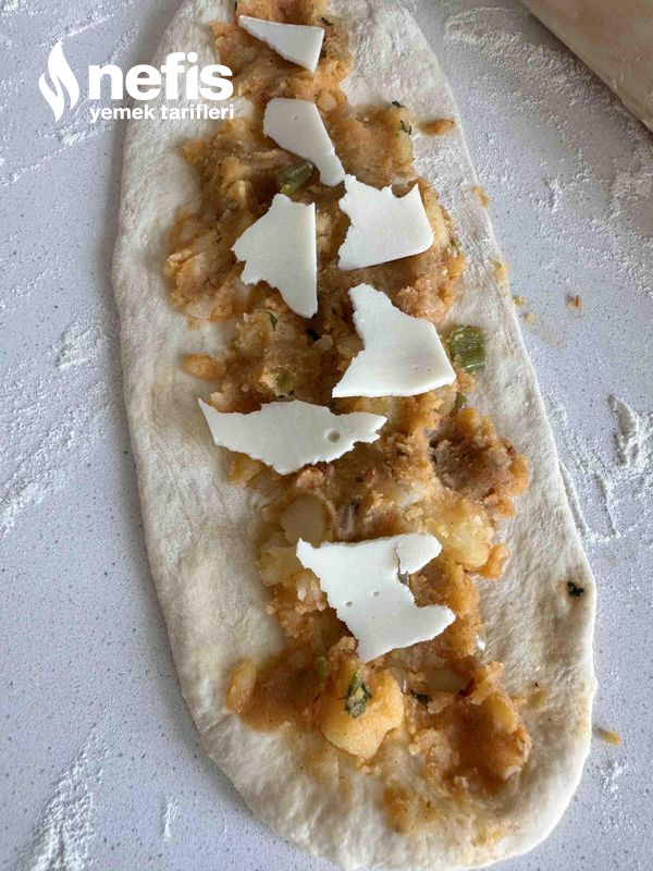 - Merdaneyle uzun açin içine patatesli ya da kıymalı iç koyalım, patateslinin üzerine kaşar ekleyelim uçlarını kapatalım.