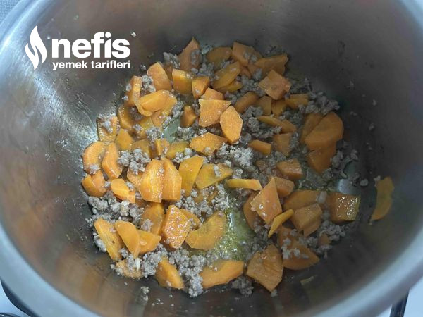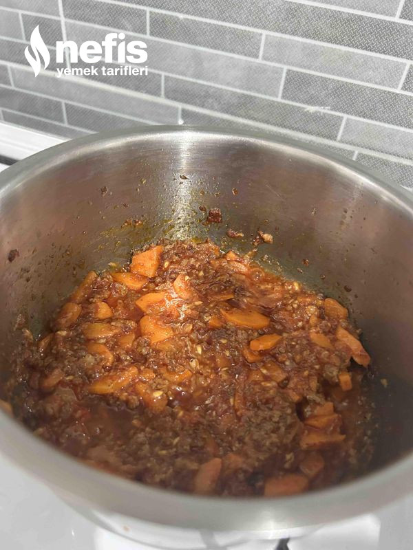 - Kıyma ve havuçlar yağda kavrulduktan sonra içine salçayı ekliyoruz ve daha sonra karabiber pulbiberi ekliyoruz.