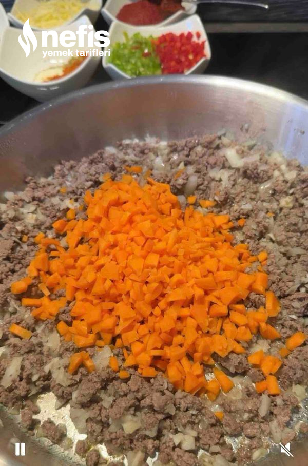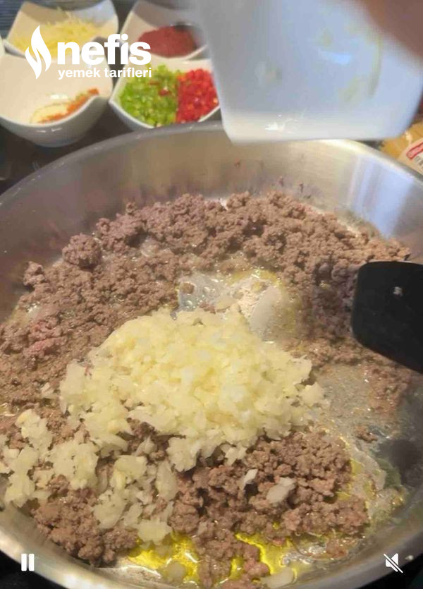 1. Tavaya kıymayı ek edip suyunu salıp çekene kadar kavuruyoruz. Üzerine zeytinyağı ve küçük kesilmiş soğan ve sarımsağı ek edip kavurmaya devam ediyoruz.