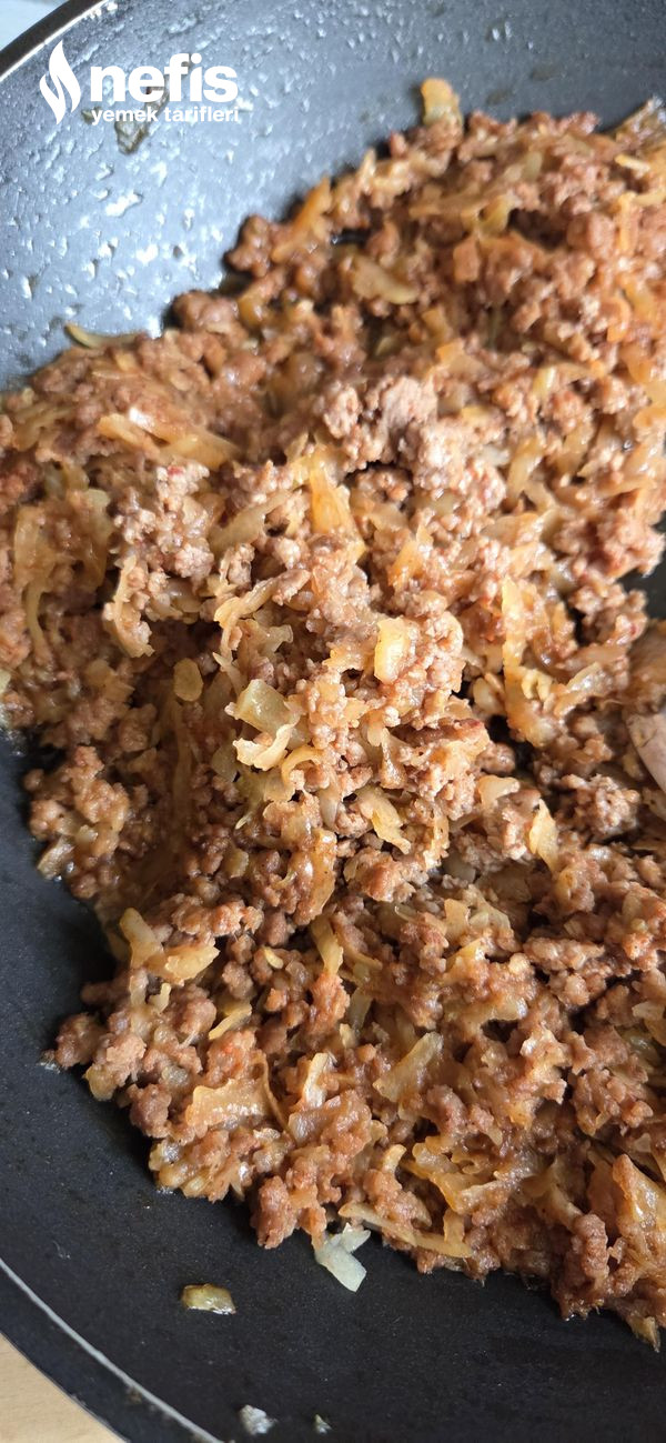 - Tavamıza kıymayı ve sıvı yağ eklenerek, kıyma kavrulur soğan eklenerek biraz daha kavrulur ve patates eklenir(patatesi rendeliyoruz).